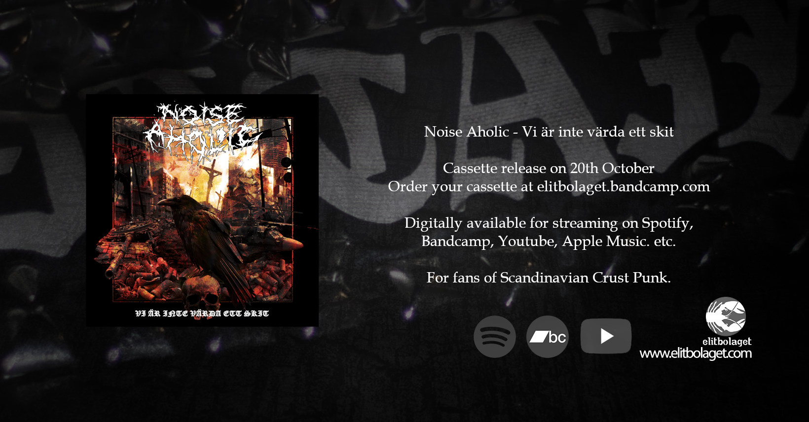 Noise Aholic, the incendiary d-beat and crust punk juggernaut, is set to unleash their long-awaited new album, "Vi är inte värda ett skit" on cassette on October 20th by Elitbolaget. "Vi är inte värda ett skit" features eleven tracks of relentless aggression, delivered with the band's signature ferocity and a multitude of guest artists from around the world.